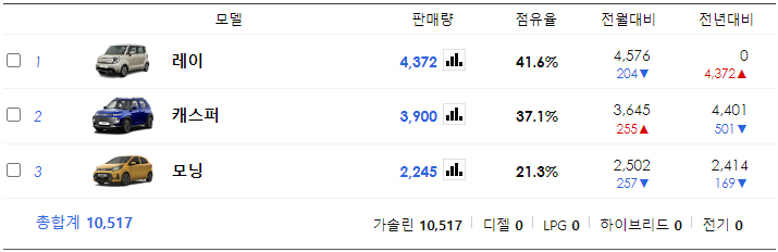 국내의 경차로는 모닝, 캐스퍼, 레이, 스파크(단종), 다마스(단종)가 있습니다.