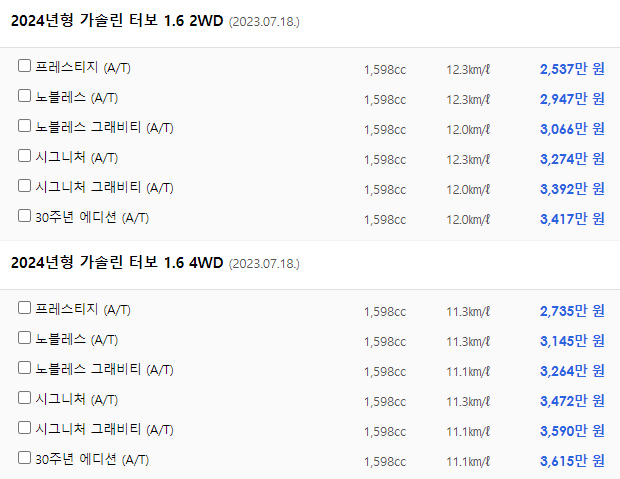 2. 가솔린 터보 시그니쳐 (A/T) 2WD : 3,274만 원