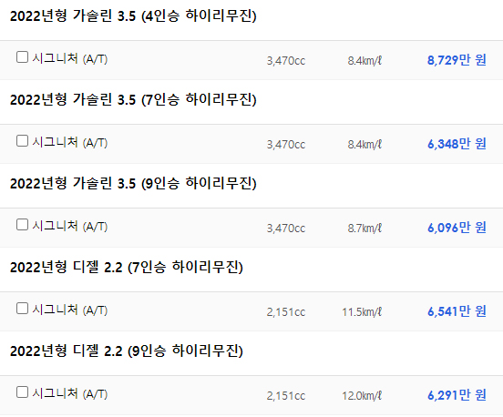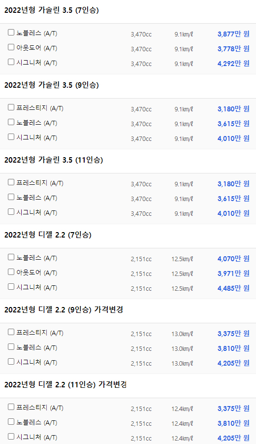 카니발은 가솔린 3.5와 디젤 2.2 그리고 7인승, 9인승, 11승으로 구분됩니다.