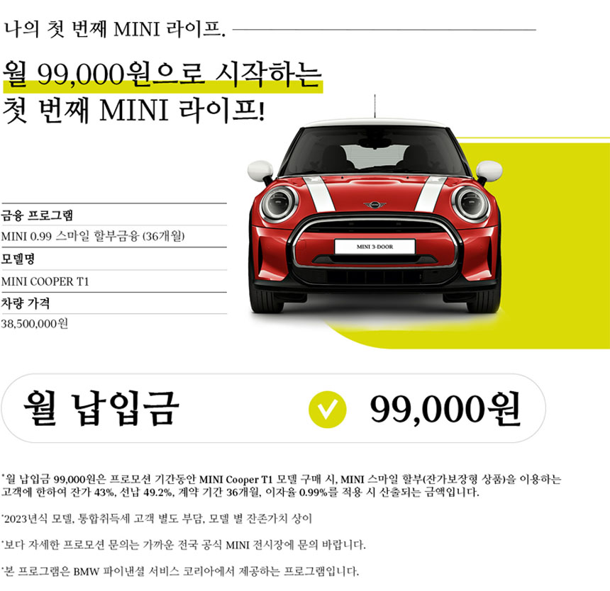 위 이미지는 미니 공식사이트 프로모션 페이지를 캡쳐한 이미지입니다. 보셨듯이 미니 저금리 상품이 고금리 시대 '월 납입금 99,000원'이라는 문구에 구매가 당기게 진행하고 있습니다. 가장 좋은 구매 케이스가 있다면 재구매 1% 할인으로 저금리 상품 36개월로 진행하면 거의 무이자가 되겠죠.