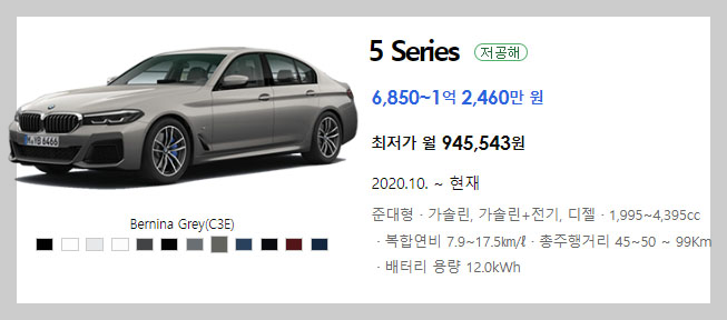 5시리즈의 경우 워낙 다양한 옵션과 가솔린, 디젤, 하이브리드 그리고 고성능 세단인 M모델까지 많은 차종이 있습니다. 가장 하위트림이면서 인기 차종인 520i 럭셔리 6,880만 원부터 M550i xDrive 1억 2,460만 원까지 다양한 라인업을 갖추고 있습니다.